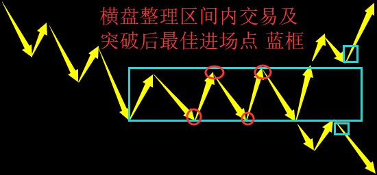 横盘整理趋势定义:最高点不断平移,最低点不断平移。横盘整理时交易策略(新手勿做):下跌趋势中在前高左右位置进场,同时进场点上方设置30到50点的止损,止盈看横盘整理的箱体下轨。同时在箱体下轨做多,并设置30至50止损点,这是箱体内部的交易。如果做空但达到止损点止损后,这时候不能马上做多,要通过行情继续确认当前的多空力道,即当轻微回踩完毕后行情继续拉升时才做多,这时你抓在了一波行情的启动点。(注:其实这就是缠论所谓的第三类买卖点)