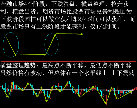 金融市场四个阶段:下跌洗盘、横盘整理、拉升获利、横盘出货,用经济学角度来说是价格会围绕着商品真实价值上下波动,波动幅度可大可小。恒指更暴利原因是因为下跌洗盘阶段同拉升阶段也可以获利。横盘整理阶段在前期很难判断,但在后期却很明显能看出来。比如下跌趋势中产生横盘整理非常容易亏损,所以要设置止损。可能在横盘整理第1次 第2次没有看出来而产生亏损,当第3次在横盘准备下单前,要判断是否已经不在下跌趋势而是横盘整理阶段。