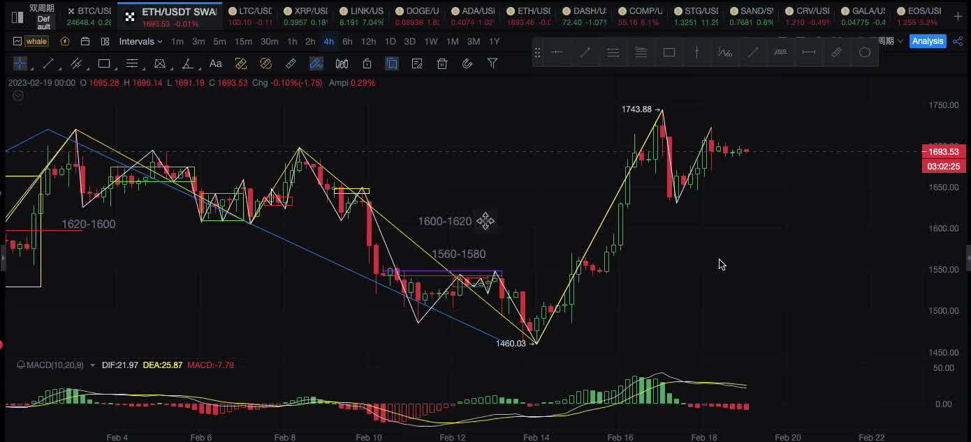 2023.2.18缠解大盘_BTC- ETH关注4H回踩多,EOS周线涨中,关注4H回踩多
