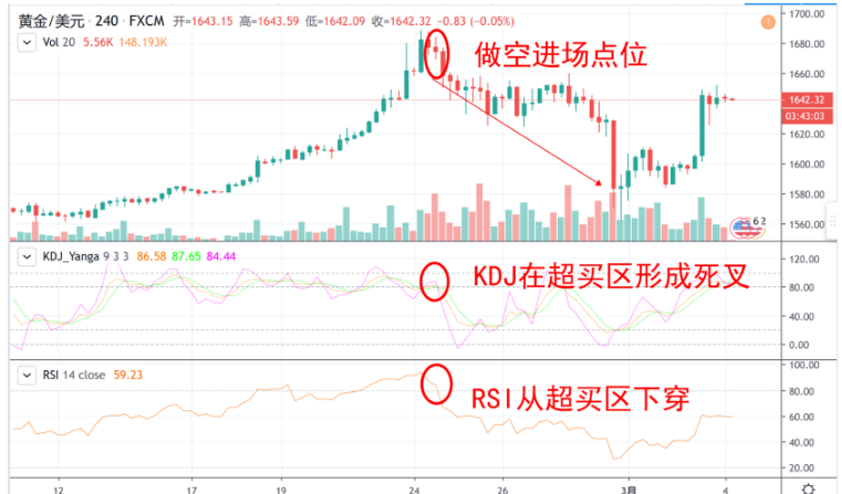 As shown in the figure, RSI fell back after breaking through 80, and KDJ formed a dead fork in the overbought zone, shorting.