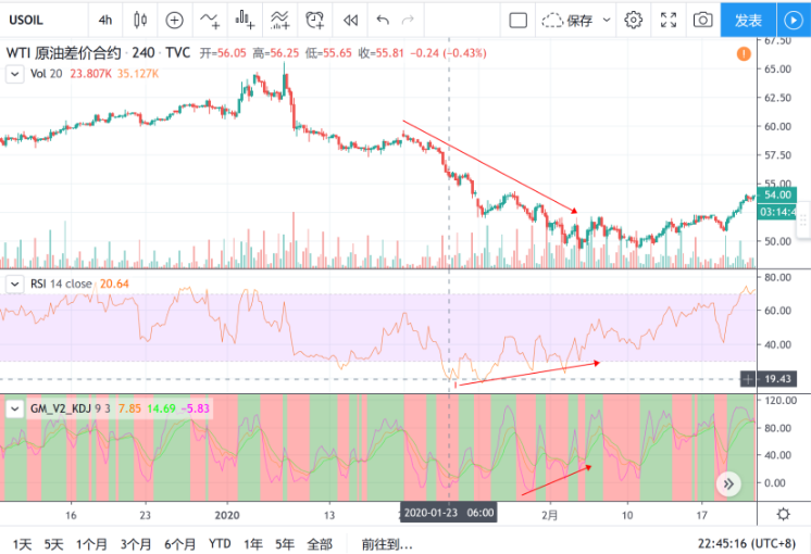 Taking the crude oil trend chart as an example, the price keeps falling, but the bottom of RSI and KDJ keeps rising, reflecting that the downward momentum is gradually exhausted, and the market outlook is bullish.