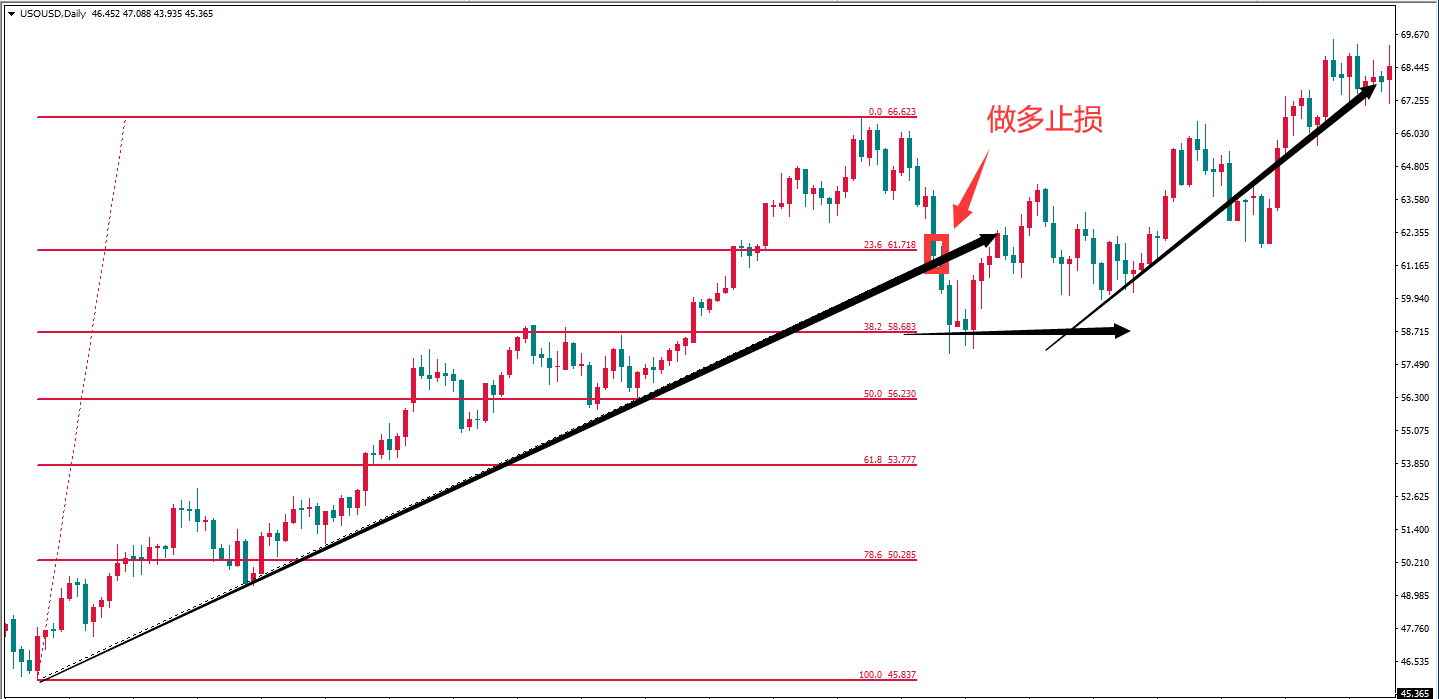 The picture above shows the trend of oil prices from the second half of 2017 to 2018. At that time, OPEC had already extended the production reduction agreement for 6 months. At the same time, the oil price began to pick up under the situation that the implementation of production reduction gradually recovered and the demand side recovered. This is the reason for long oil prices. The main reason is, in addition, from a technical perspective, if a trader goes long on the upward trend line, he should have more profit opportunities in the early stage, but if the trend line breaks down, theoretically, the bulls should stop loss and leave the market, because the technical position grounds were breached;