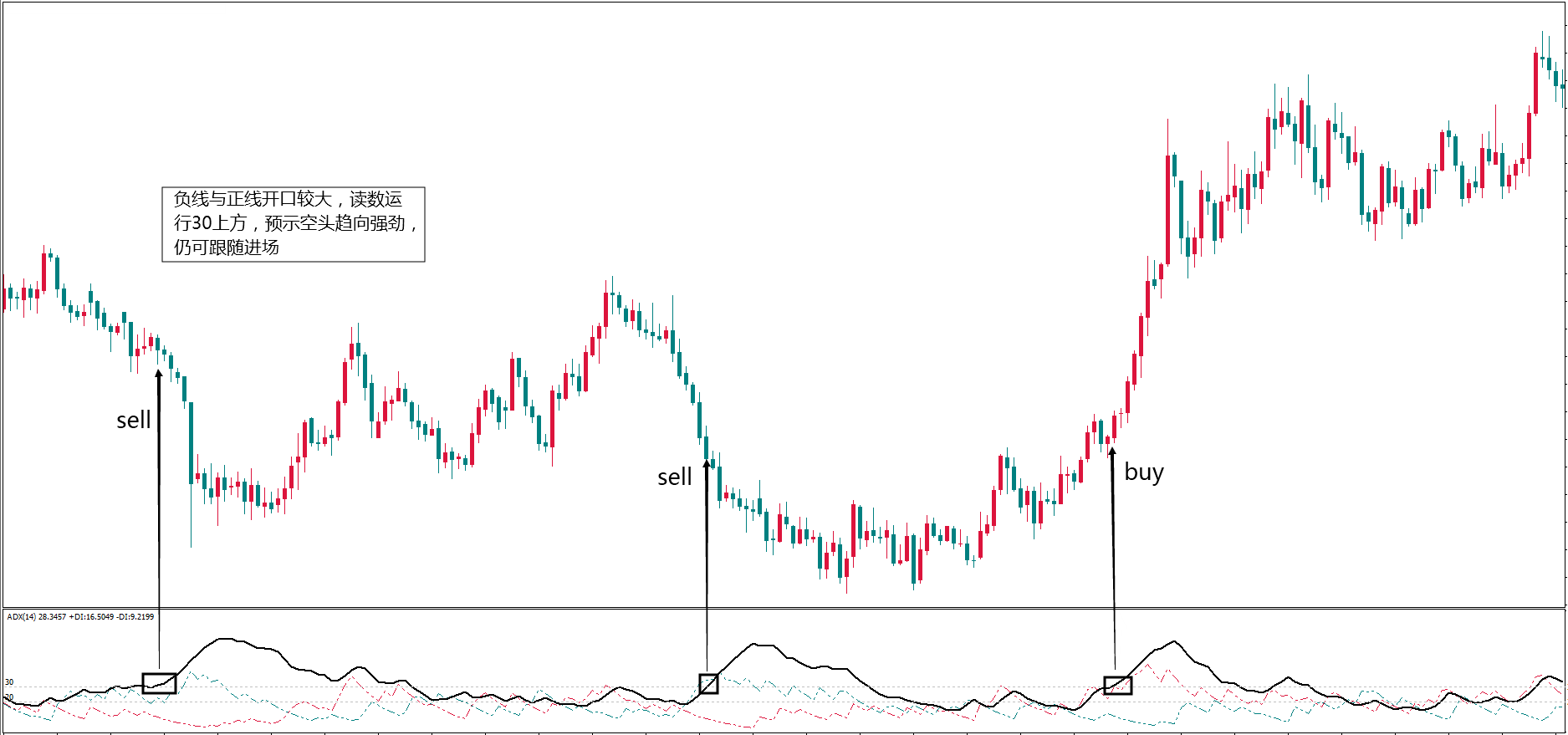 In the application of ADX, it is very important to observe the reading of ADX. Generally, when the reading is above 30, the trend tends to be relatively strong. When a trader finds a trend and has the idea of continuing to enter the market, if so When the opening of the positive and negative lines is relatively large, and the ADX value runs above 30, you can intervene decisively. As shown below: