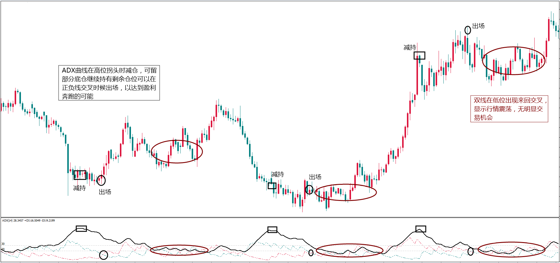 From the picture above, traders can find that when the ADX curve turns at a high level, it can be said that this trend is basically over. Therefore, at this time, traders need to make profits and reduce positions in time, and now take most of the profits into their pockets. . However, in the third turn, the price still showed a aftermath rise after the turn of the curve, and then there was a shock trend, so if we choose to exit the remaining bottom position when the positive and negative lines cross, because The risk has been controlled by reducing the position before, and this time the bottom position has allowed the profit to run again.
