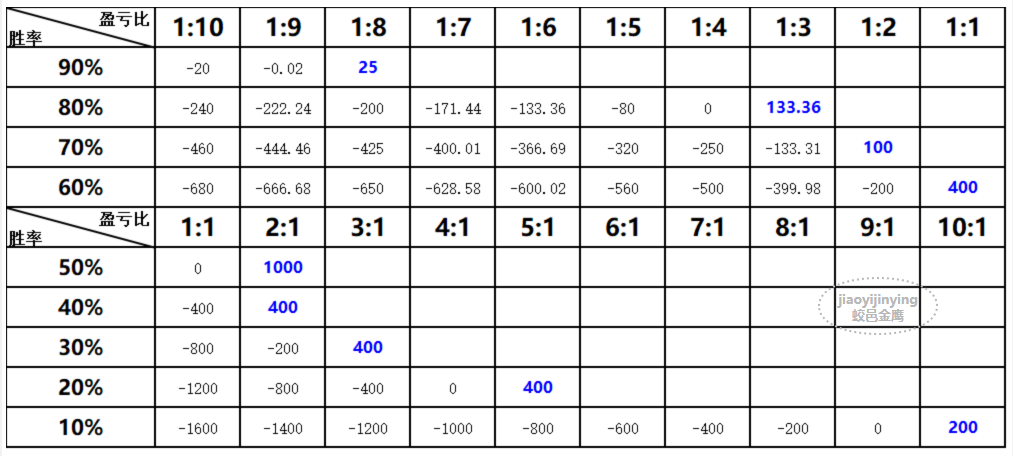 It can be seen from this result that if the winning rate is below 50%, the profit-loss ratio must be increased accordingly to be able to make a profit, that is, the expected value is positive, and the position will not be liquidated; and if the profit-loss ratio is below 1:1, it is necessary to Increase your chances of winning accordingly.