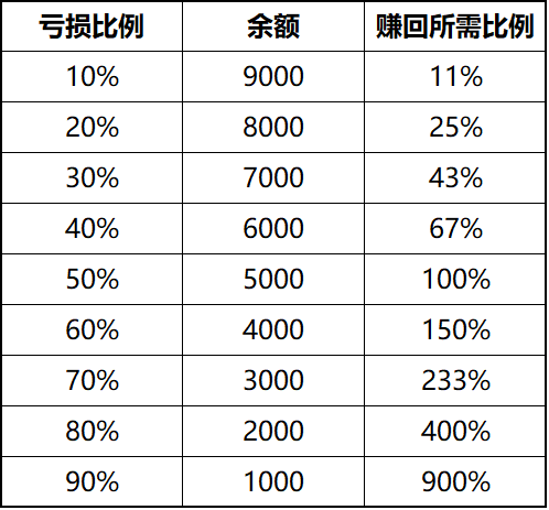The following is a schematic diagram of the loss ratio and the ratio required to earn back the principal for a $10,000 account: