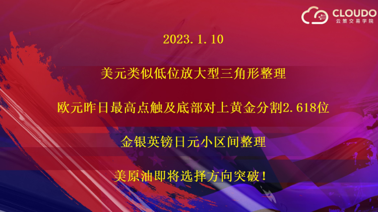 2023.1.10 美元类似低位放大型三角形整理,欧元昨日最高点触及底部对上黄金分割2.618位,金银英镑日元小区间整理 美原油即将选择方向突破