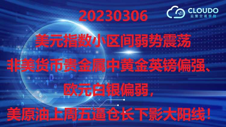 20230306-美元指数小区间弱势震荡,非美货币贵金属中黄金英镑偏强欧元白银偏弱,美原油上周五逼仓长下影大阳线!