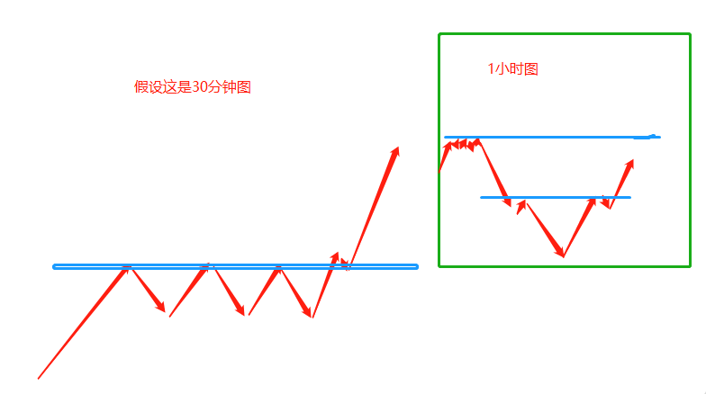 Seperti yang ditunjukkan dalam gambar di atas, sebelah kiri ialah carta 30 minit. Pasaran menembusi selepas kejutan berbentuk kotak. Kotak biru dalam gambar kiri sepadan dengan garis pepejal biru di bawah carta 1 jam kanan.