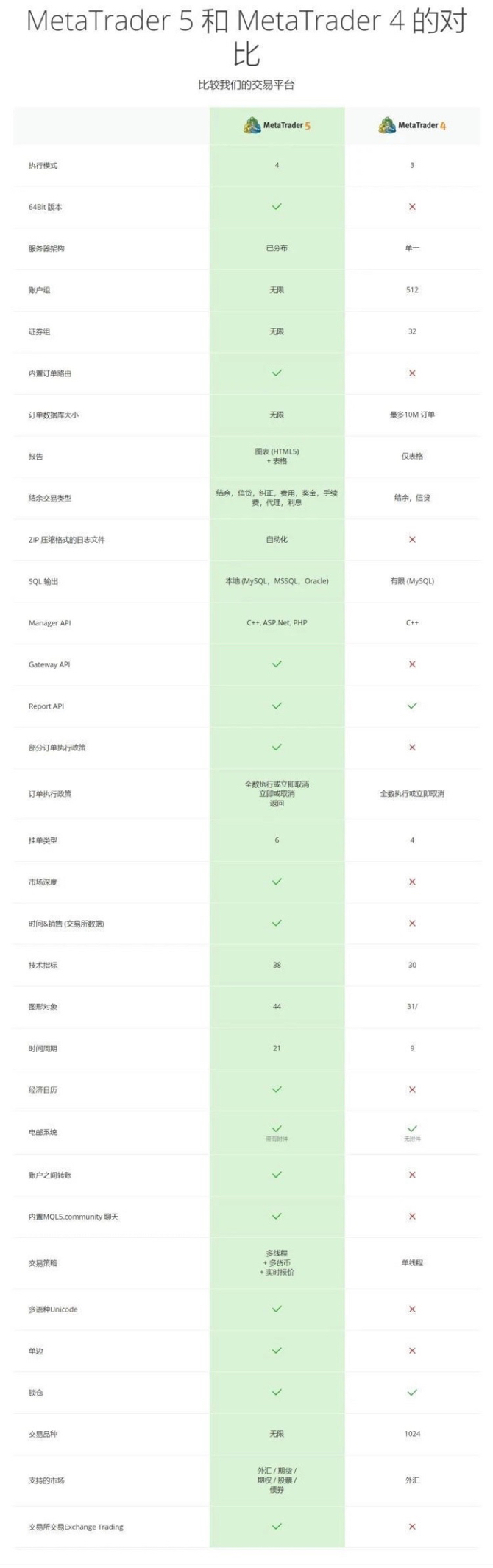 MT4 ออกแบบมาเป็นพิเศษโดย MetaQuotes สำหรับธุรกรรมในตลาดแลกเปลี่ยนเงินตราต่างประเทศ และรองรับธุรกรรม CFD ระบบ MT5 ขยายขอบเขตของตลาดที่รองรับ นอกจากการแลกเปลี่ยนเงินตราต่างประเทศแล้ว นักลงทุนยังสามารถใช้เพื่อซื้อขายฟิวเจอร์ส หุ้น พันธบัตร ออปชัน และผลิตภัณฑ์อื่นๆ นอกจากนี้ เมื่อพัฒนาและส่งเสริมแพลตฟอร์ม MT5 MetaQuotes ตั้งเป้าที่จะสร้างบันทึกธุรกรรมการค้าปลีกและสินค้าโภคภัณฑ์ที่สูงเป็นประวัติการณ์ ดังนั้น จุดเน้นของการออกแบบซอฟต์แวร์จึงแตกต่างกันด้วย เห็นได้จากด้านบนว่า MT4 และ MT5 ได้รับการสนับสนุนโดยตลาดที่แตกต่างกัน ซึ่งเป็นประเด็นสำคัญประการที่สองของความแตกต่าง